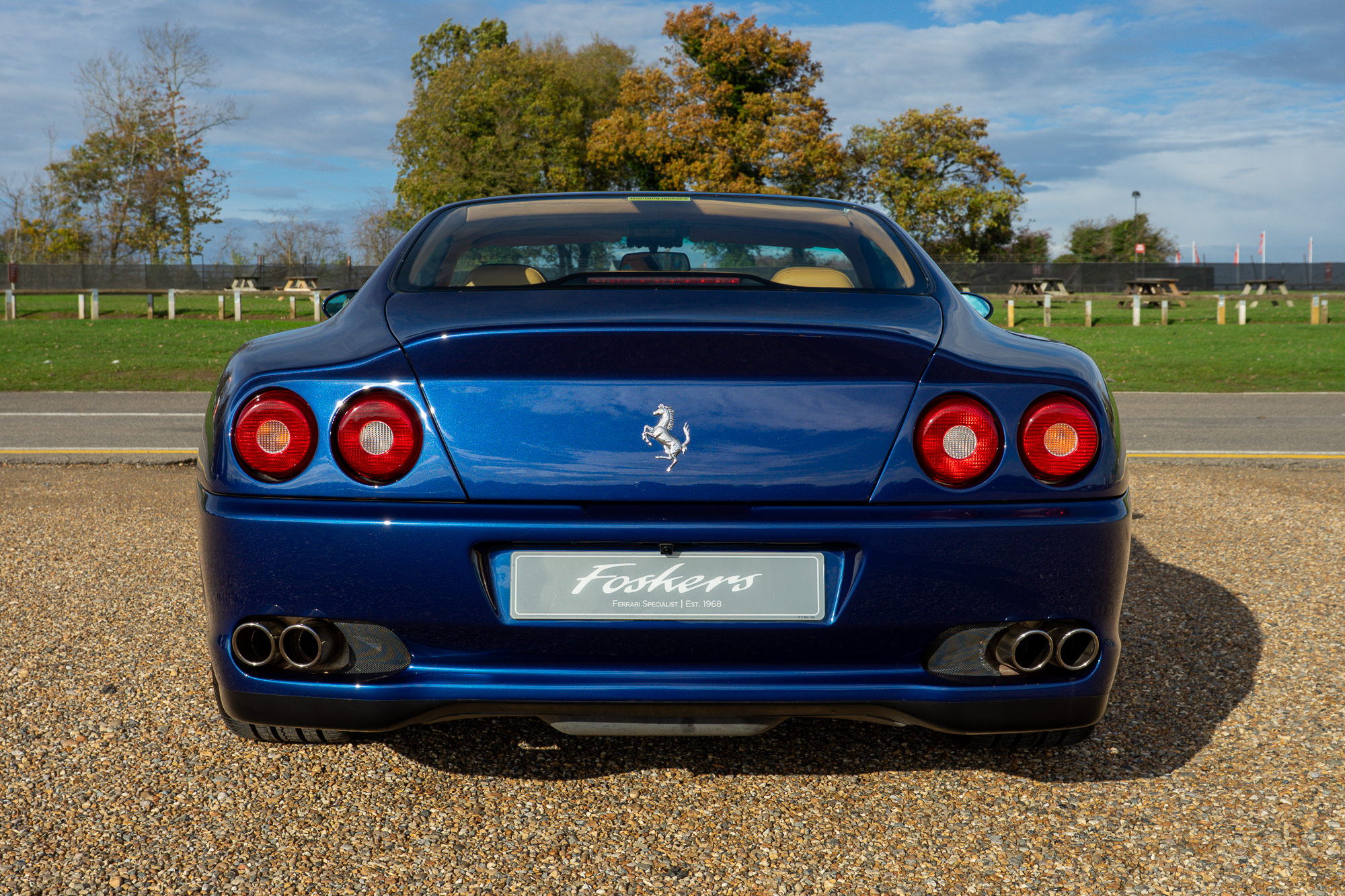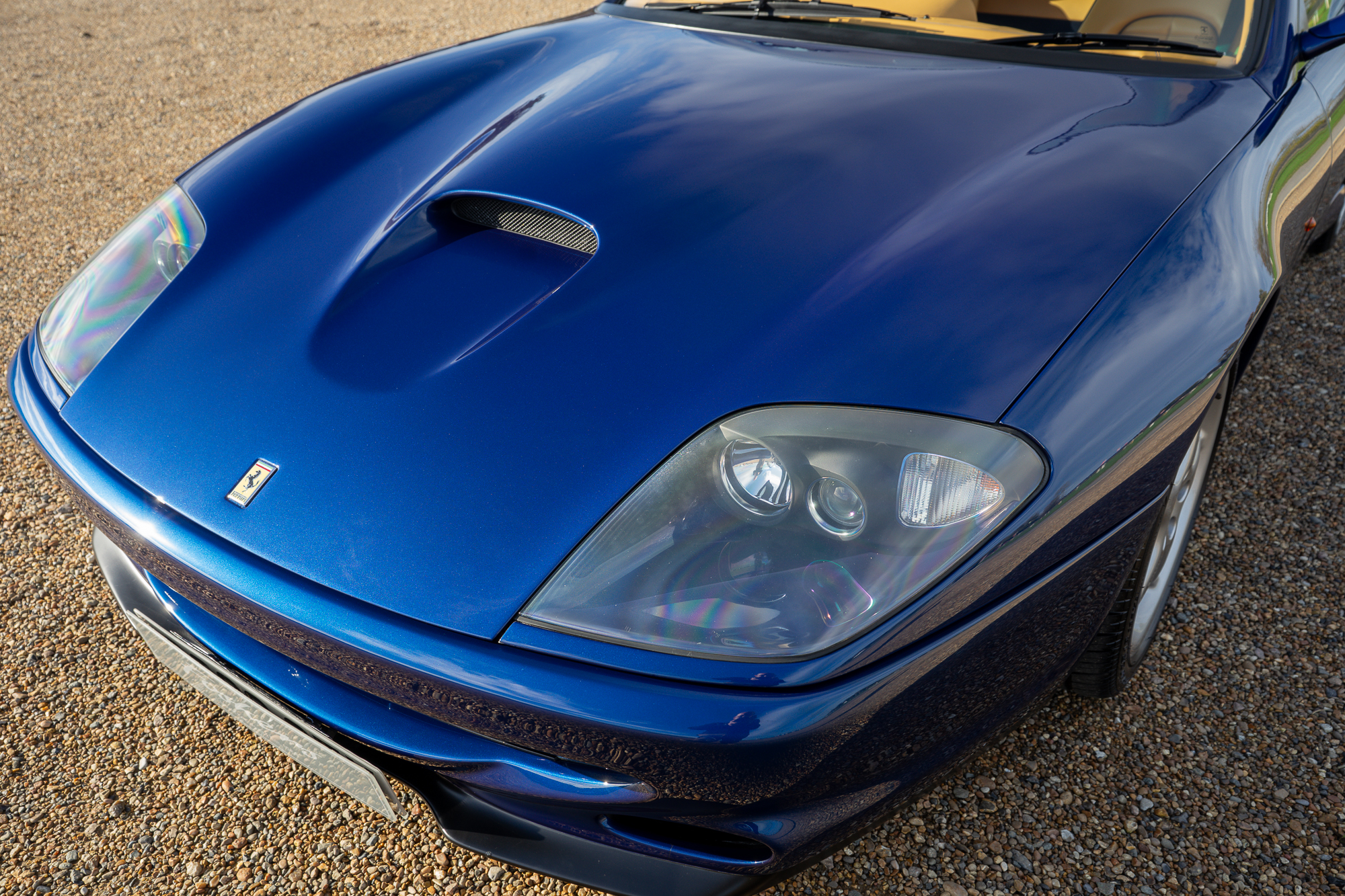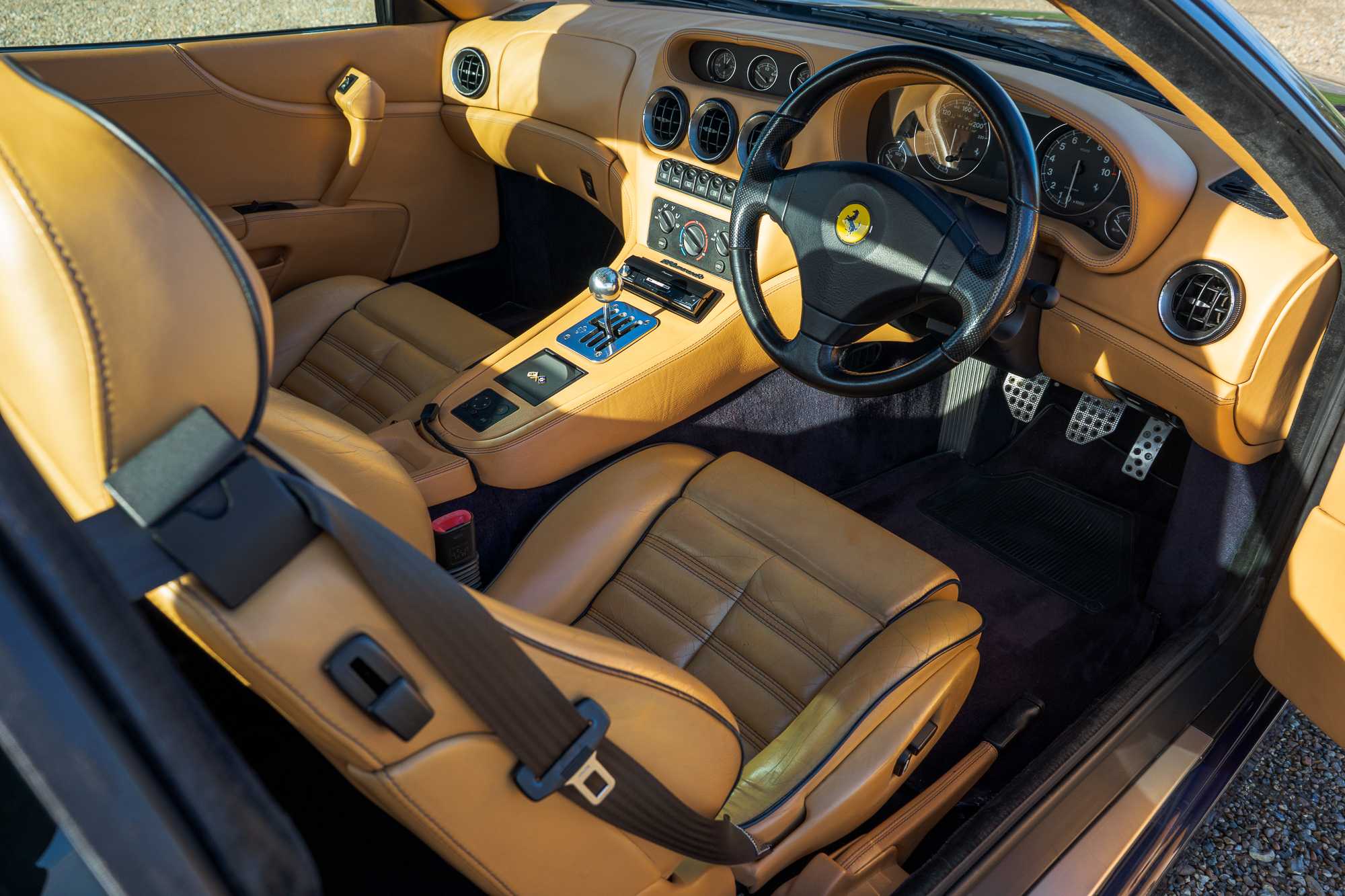 Delivered March 2000 by JCT600, specified in Tour de France Blu over tan with blue carpets. Optioned with blue piping, blue stitching, full upper dash in tan as well as A-pillars and headlining. After paint correction in 2022, full PPF was applied and Quicksilver back boxes installed. In addition, a Pioneer head unit with reversing camera have been fitted and upgraded HiFi. Having been serviced throughout its life by Ferrari Main Dealers and Specialists, this example has been maintained to a very high standard and cherished by its owner, will make a fine addition to any collection.